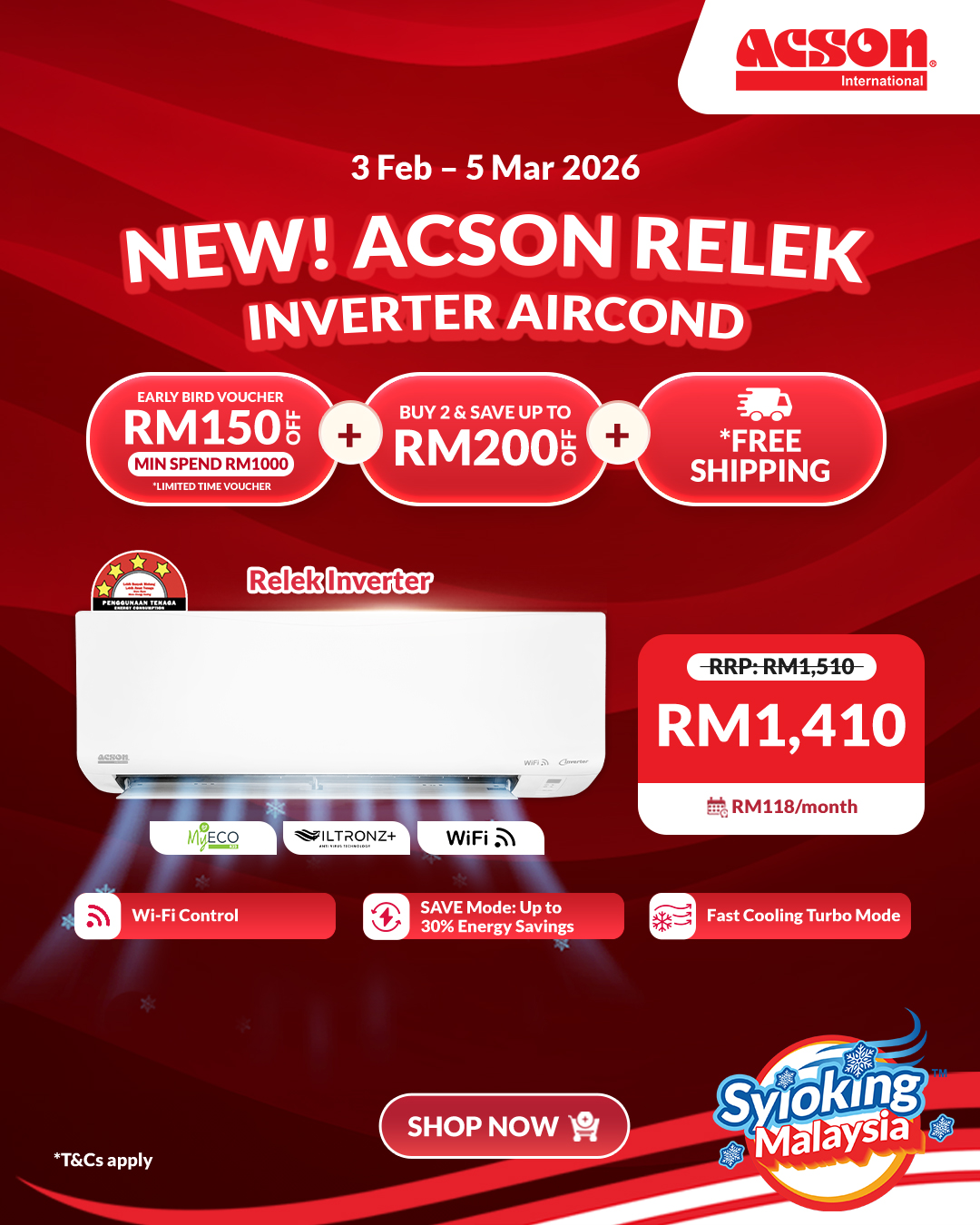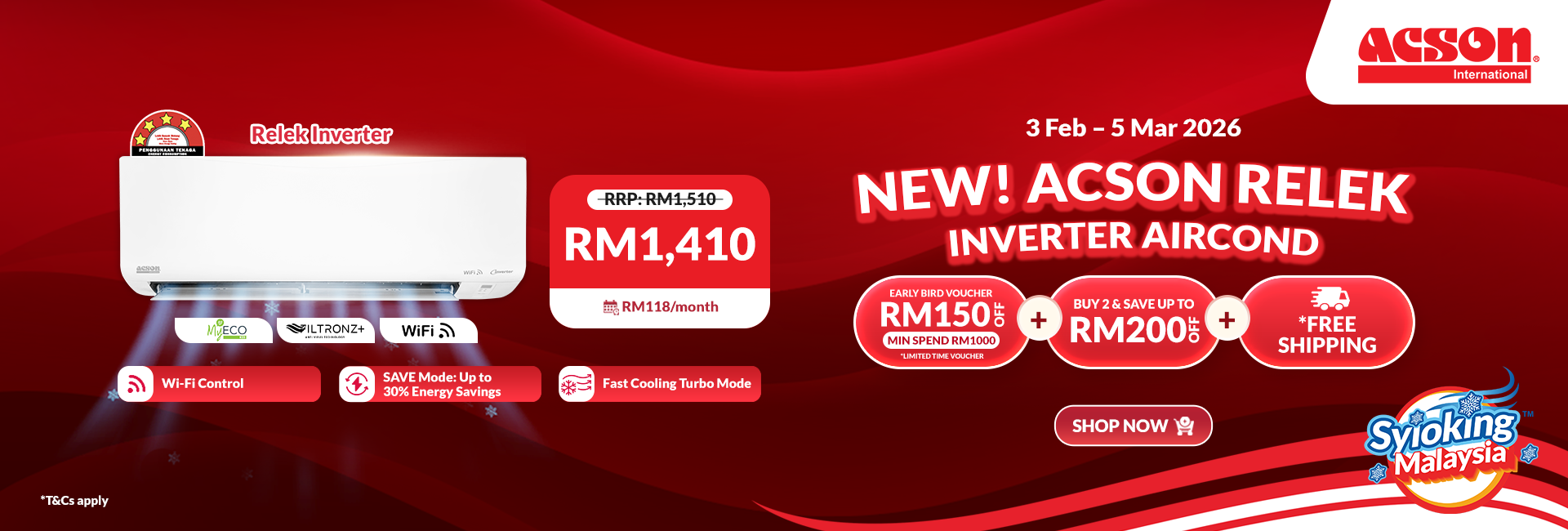 RelekService PromoTrade-InExtended Warranty Desktop Air PurifierRM259.00Portable DehumidifierRM259.00Foldable Floor FanRM359.00DehumidifierRM379.00Mini USB Table Fan (Pastel Green)RM109.00REINO Inverter (1.0HP) Air Conditioner R32 WiFiRM1,700.00REINO+ Inverter (1.0HP) Air Conditioner R32 WiFiRM1,920.00REINO+ Inverter (1.5HP) Air Conditioner R32 WiFiRM2,120.00AVO Non-Inverter (1.0HP) Air Conditioner R32RM1,390.00REINO Inverter (1.5HP) Air Conditioner R32 WiFiRM2,000.00